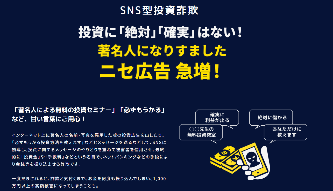 例えば、最近のSNS型投資詐欺では、著名人になりすました偽の広告が出回り、それにクリックしたユーザーが被害にあうケースも増加しています。そもそも、著名人が無料で投資教室を開催したり、利益が確実に出る投資話を無料で教えたりすることなど、現実的にはありえません。