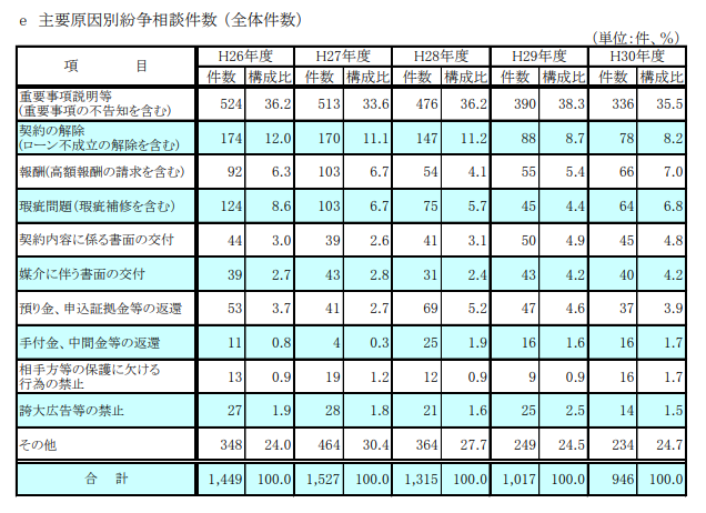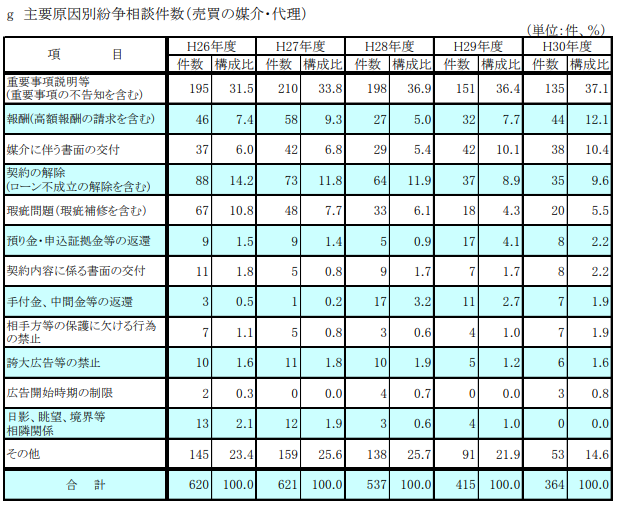 主要原因別紛争相談でも項目をみても、重要事項説明等が37.1%と群を抜いて多く、これは但し書されている「重要事項の不告知」が要因ではないかと推察されます。