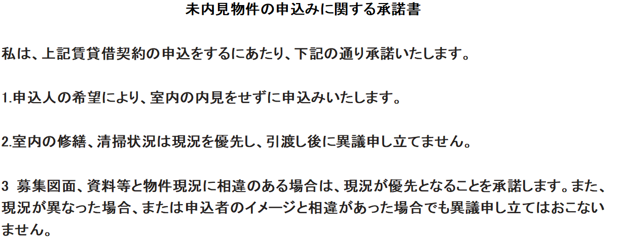 ●借主は、事情により未内見で契約を締結することに同意し、以下を承諾する証として本書を差し入れる。