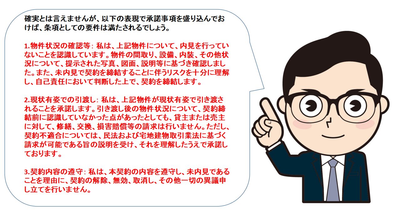 あくまで調査義務を果たし、適切な説明を実施したうえで、例示した条項を盛り込んだ「未内見承諾書」を差し入れて貰えば、後日紛争を防止できる可能性が高まります。