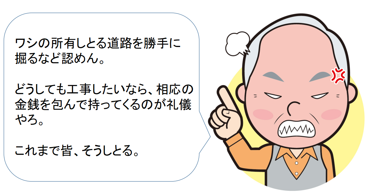 そこで、知己の不動産業者が工事の開始を、私道所有者に説明へ出向くと次のような対応をされました。