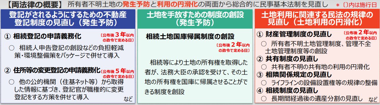 令和5年4月1日に施行された改正民法は、主に所有者不明土地問題の解決を目的としています。つまり、所有者不明土地の発生を予防し、土地利用の円滑化を促進するために法律が整備されたのです。