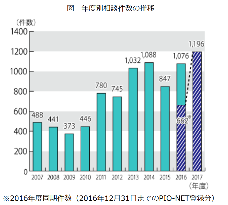 原野商法の二次被害トラブルだけを参考にはできませんが、国民生活センターは2017年度の相談件数は1,196件となり、前年同期と比較して1.8倍に増加したことを公表しています。
