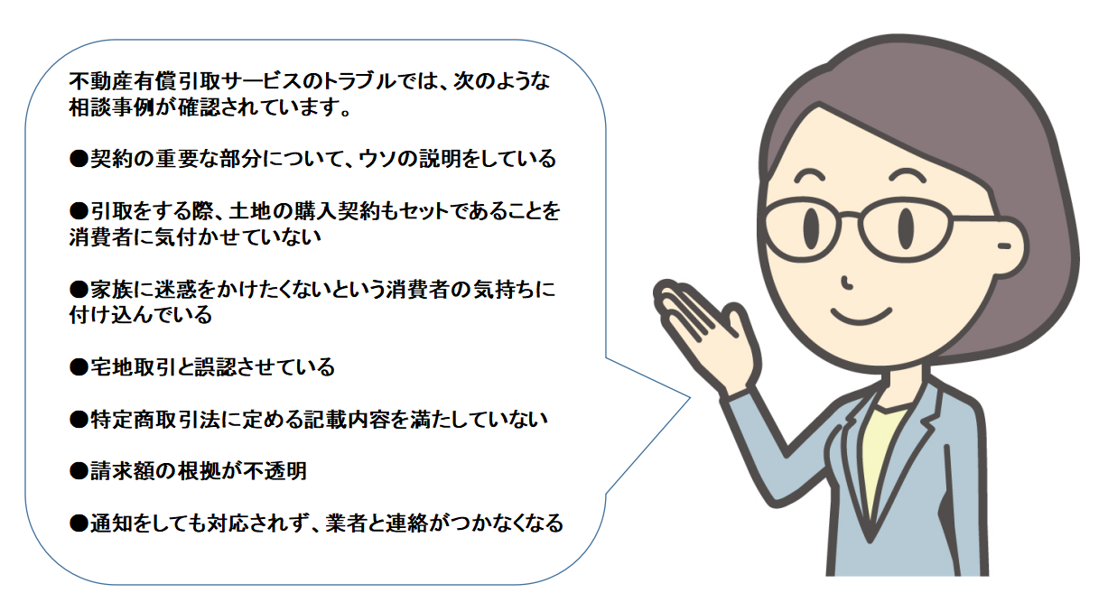 ところが、前者の場合は、「売却にあたっては事前の整地や地積調査が必要」と説明して調査費用を請求し、後者においては高額な引取費用を請求する、あるいは引取費用を振り込んだ途端、事業者と連絡がつかなくなるほか、市場価格で売却可能であるにもかかわらず、引取サービスに回されたなどのケースが確認されています。