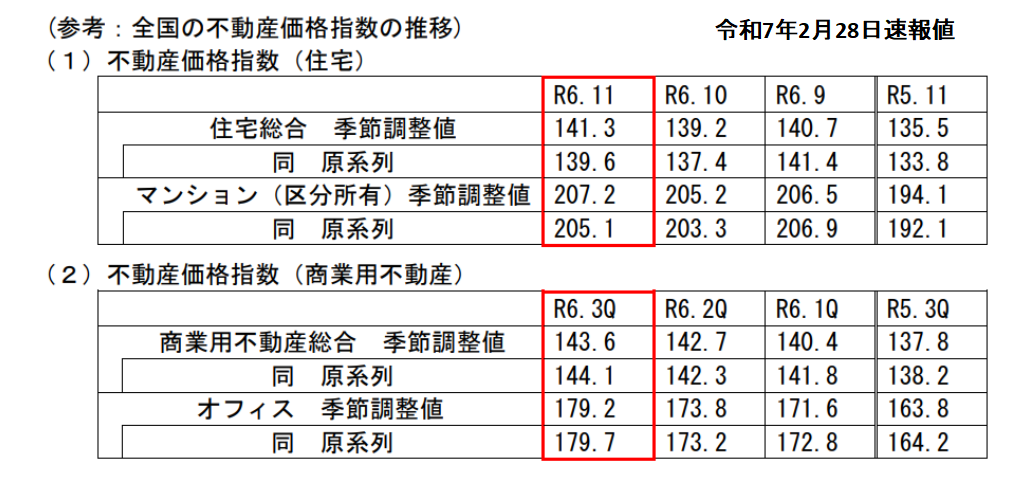 不動産価格の動向を示す指数で、国土交通省が全国の住宅(住宅地、戸建て住宅、区分所有マンション)について集積した「不動産の取引価格情報提供制度」のデータを活用して算出しています。この指数は、ヘドニック法(住宅の価格と特性の関係を分析する統計的手法)を用い、個別物件の品質を調整したうえで推計されています。