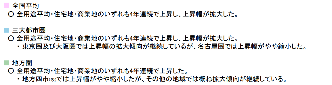 全用途平均・住宅地・商業地のいずれも、4年連続で上昇しており、特に三大都市圏では上昇幅が拡大しています。地方圏も引き続き上昇傾向を見せており、全体として上昇基調が続いていることが確認できます。