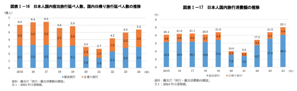 このような訪日外国人の増加に対し、日本人の国内旅行消費額こそ2015年以降最高となる25.1兆円を記録しているものの、国内旅行者数は2017年に記録した6.5億人を大きく下回る5.4億人に留まっています。