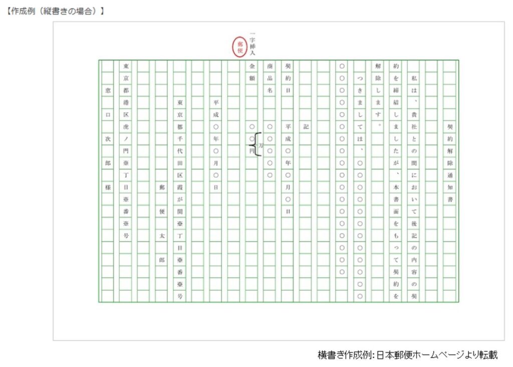 ●差出人:日付(作成日または差出日)、氏名(法人名)、住所、押印(押印は形式上任意ですが、訂正印との整合性や文書の真正性を確保する意味合いから、慣例的に推奨されています)。