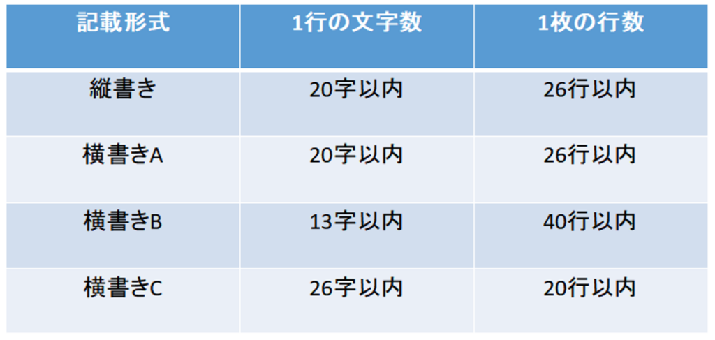 しかし、具体的な行数や1行あたりの文字数は次の通り厳格に定められています。