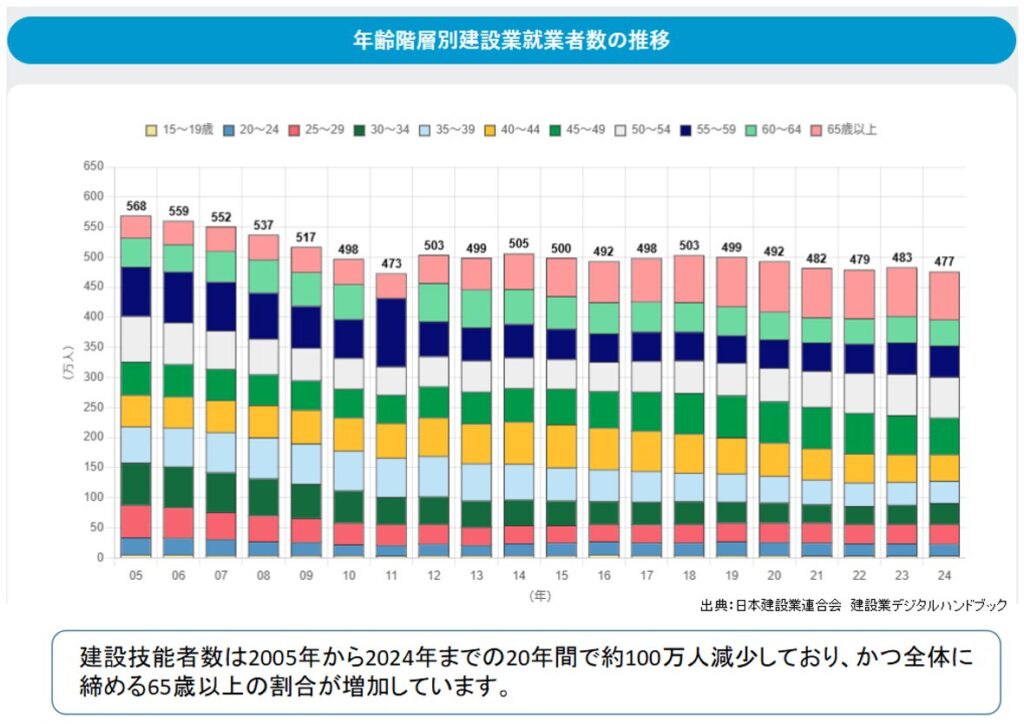 建設技能労働者の高齢化と新規入職者の不足は10年以上前から指摘されてきましたが、2005年から2024年までの20年間で技能労働者数はおよそ100万人減少しています。