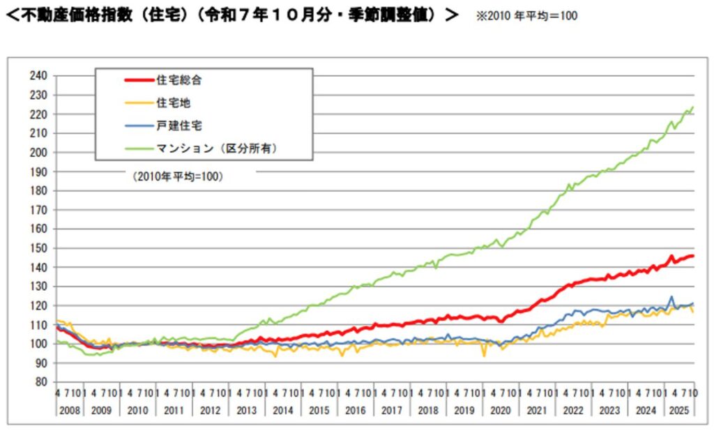 国土交通省の不動産価格指数によれば、2025年10月と2010年10月を比較した場合、住宅総合指数は約40%上昇、分譲マンションは約120%上昇しています(同指数は品質調整済みの相対指数であり、実勢価格の単純比較ではありません)。