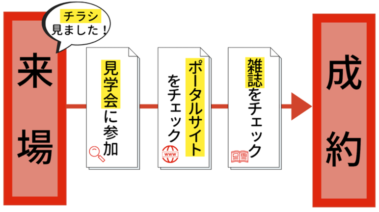 例えば、チラシを見て「相談会にいってみよう」と来場した顧客も、最終的に契約を決めるまでに、見学会に参加してみたり、あるいは雑誌やポータルサイトの情報を目にしたりすることもあるでしょう。