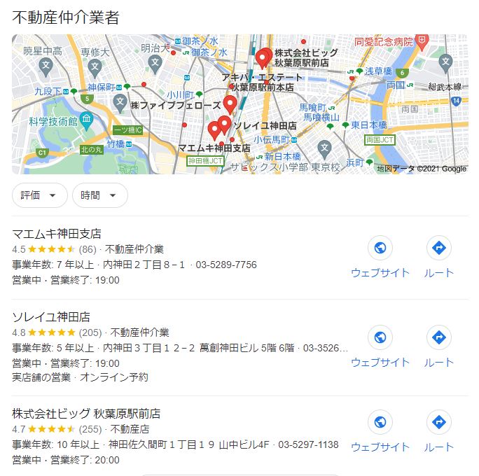 SEO対策は「エリア×不動産」で検索すると、ポータルサイトや一括査定サイトが表示されますが、MEOではあくまで店舗を構えている事業者が表示されます。