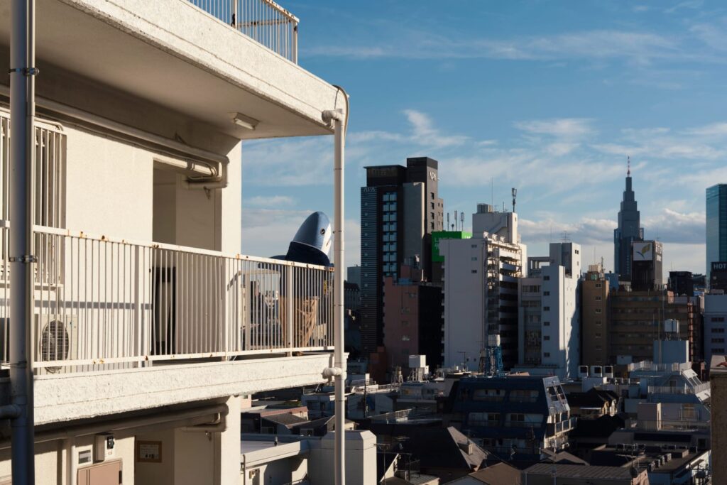 当該物件の共用廊下から西新宿のビル街を望む