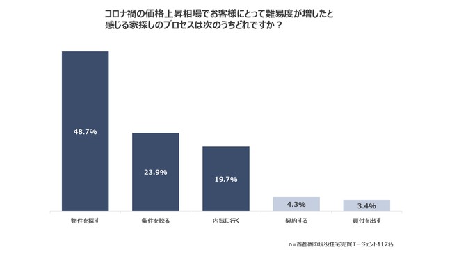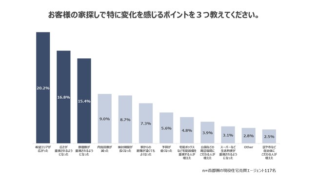 もう1つ変化が目立ったポイントとしては、消費者にとっての「物件を探す過程が難しくなった」という点で、対象者の半数程度がそのように回答しています。物件探しが難化した背景としては、物件が流動化し無くなるスピードが速くなったことや、需要の増加により価格が高騰したこと、さらには在宅時間の長時間化によって選択時のこだわりが強くなった点が挙げられます。