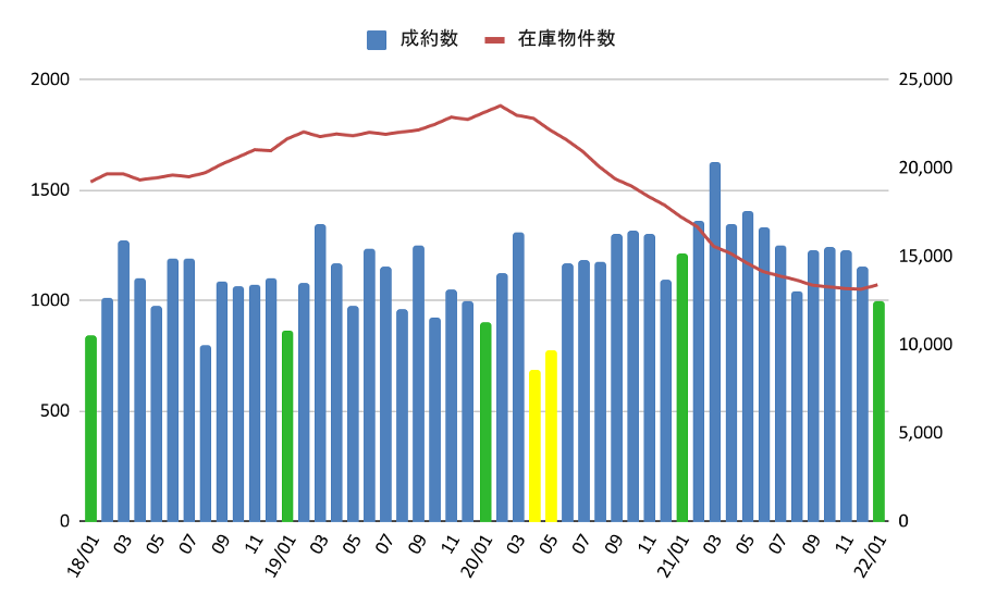 ※グラフ見方:左軸が成約件数、右軸が物件数
