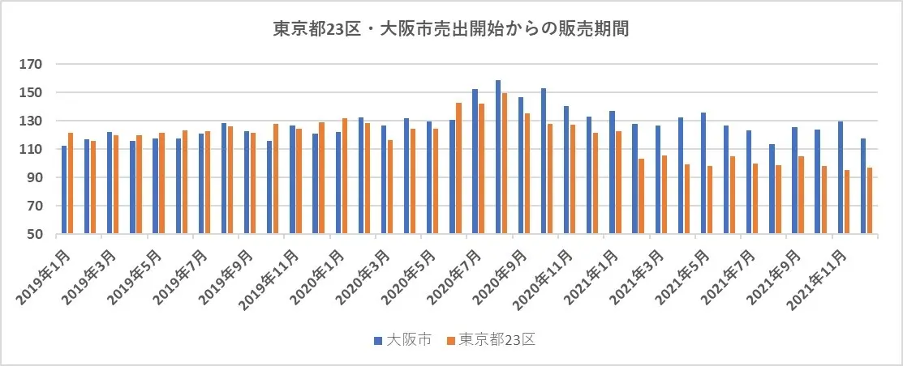 以下のグラフ③は、東京23区と大阪市の中古マンションの売出開始から販売終了までの平均日数をまとめたものです。